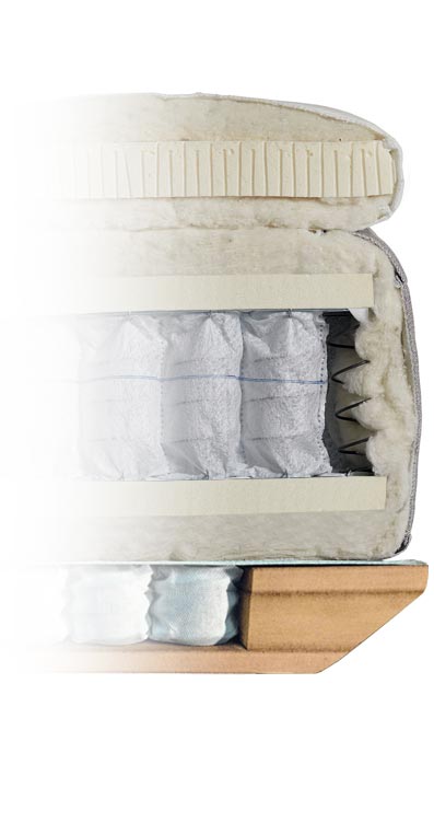 In a Carpe Noctem bed measuring 180x200cm, there are a total of: 10,800g of wool (60%) and cotton (40%) layers, and 1,658 pocket springs. The weight of the 180x200cm bed is a total of 200kg.